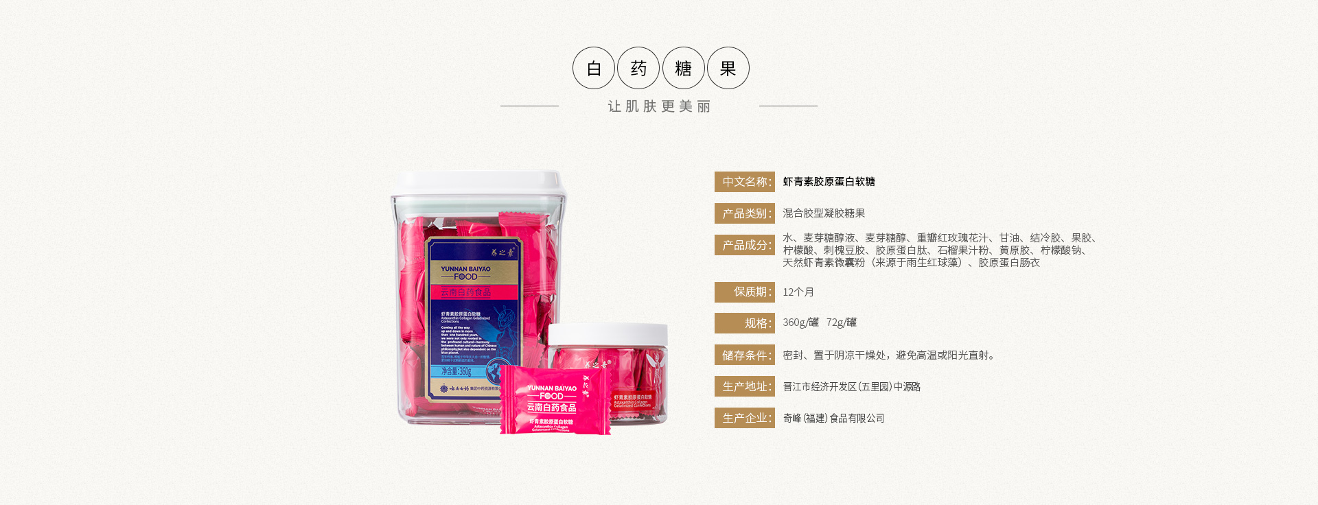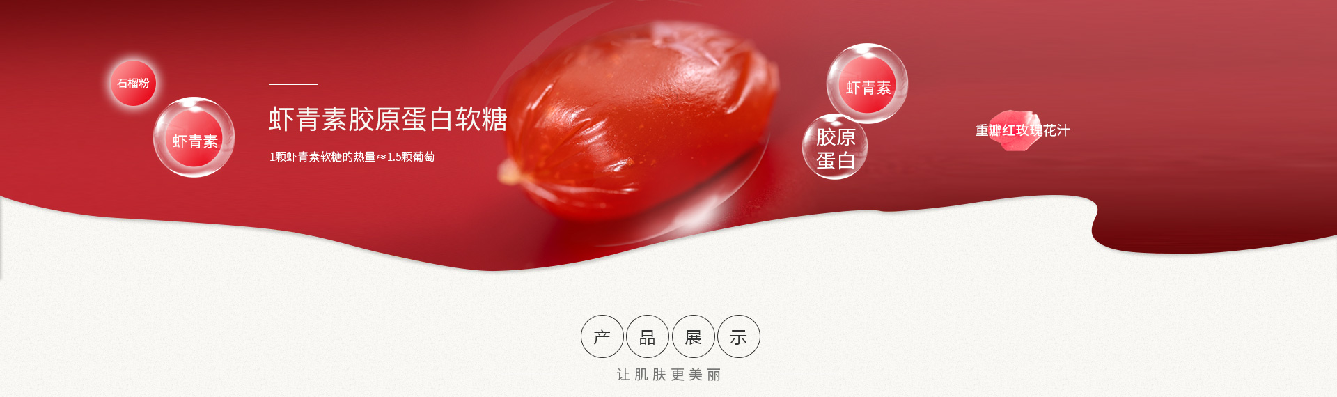内含天然虾青素、重瓣红玫瑰花汁、胶原蛋白肽、石榴果汁粉等肌肤挚爱的营养元素;